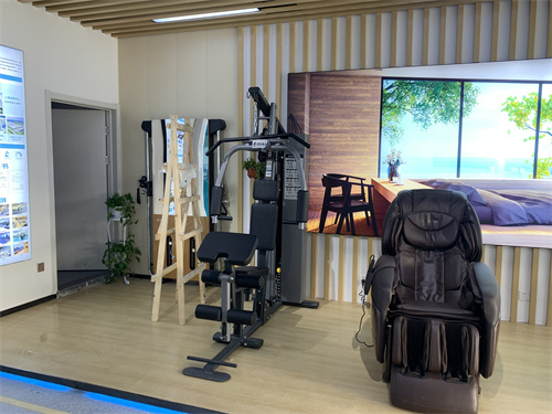 私家健身区是我们根据济南人当地的情形,选择了几款适用于我们的有氧和无氧、休闲的产品,比如单人站,占地面积小,而且适合个人使用的力量器械;跑步机、椭圆机和动感单车则重在强化我们的心肺能力,让我们耐力更好;壁挂式拉绳训练器占空间更小,可以及时纠正我们不太好的锻炼姿势,还可以根据自身能力,调整我们的锻炼强度。