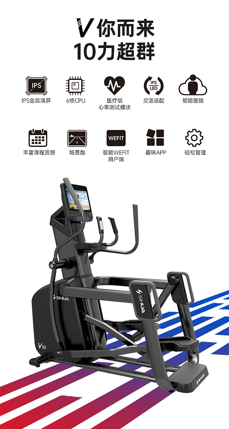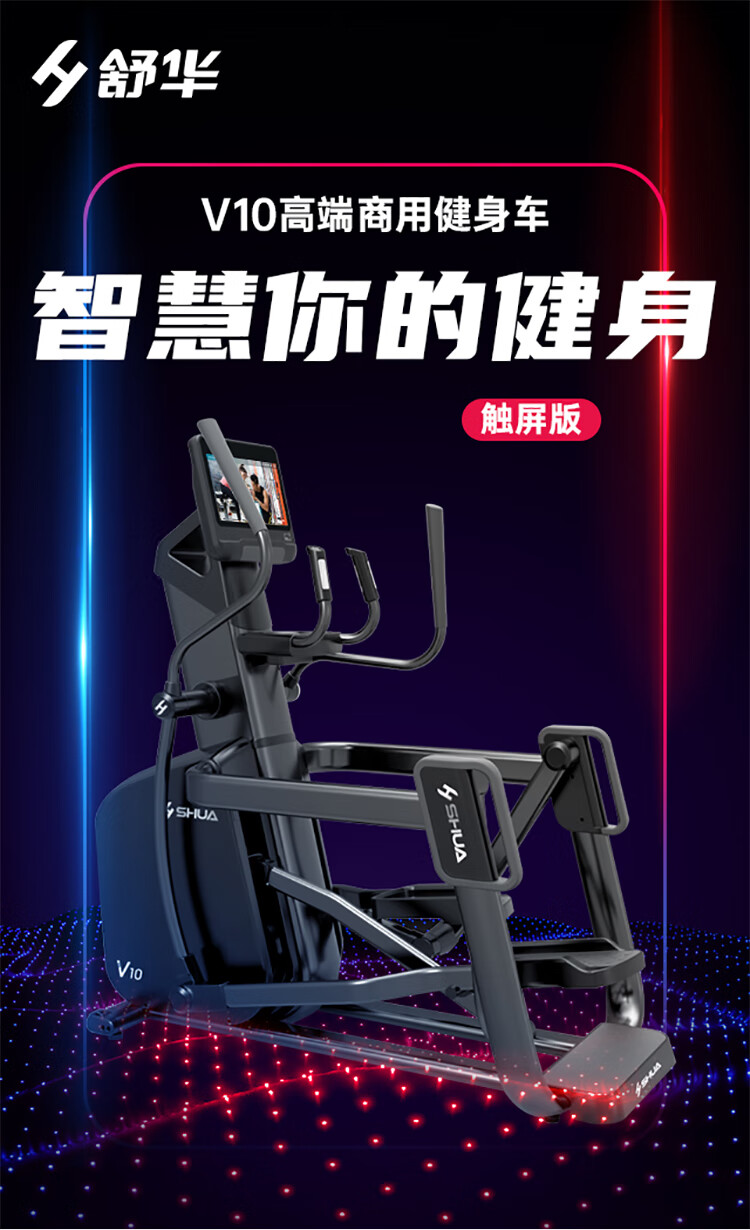 舒华立式商用健身车SH-B9100U(V10)触屏版拥有超大显示和操作屏幕, 可以任意设置阻力、时间和距离等参数,还可以即时显示心跳和转速等数据,同时,SH-B9100U提供多项科学运动处方,更轻松掌握运动节奏。